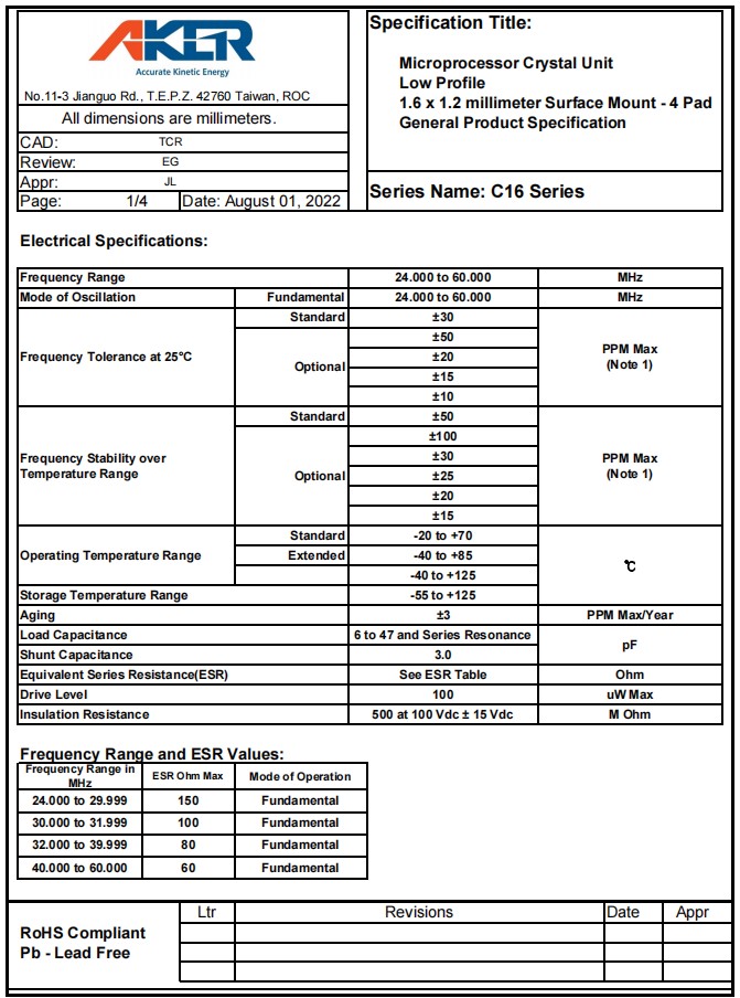 C1E-16.000-12-20100-A-X1-R | Aker安碁 | CRYSTAL, 2016, 16.000MHZ, 12PF, | C1E Auto | 16 MHz |