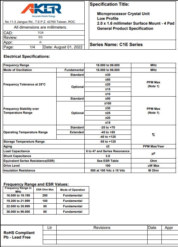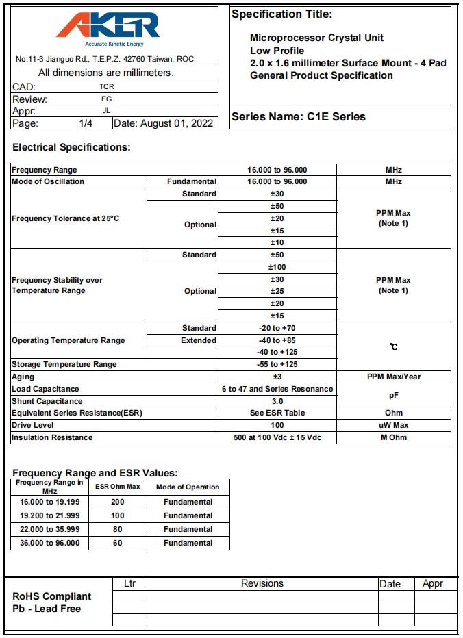 C1E-16.000-10-1530-X-R | Aker安碁晶振 | 石英晶體 | Microprocessor Crystal Unit Low Profile 2.0 x 1.6 millimeter Surface Mount |