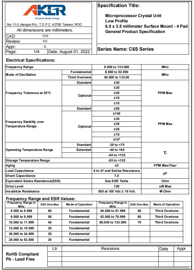C6S-16.000-12-5050-X-R | Aker安碁 | CRYSTAL 16MHZ 12PF SMD | C6S | 16 MHz |