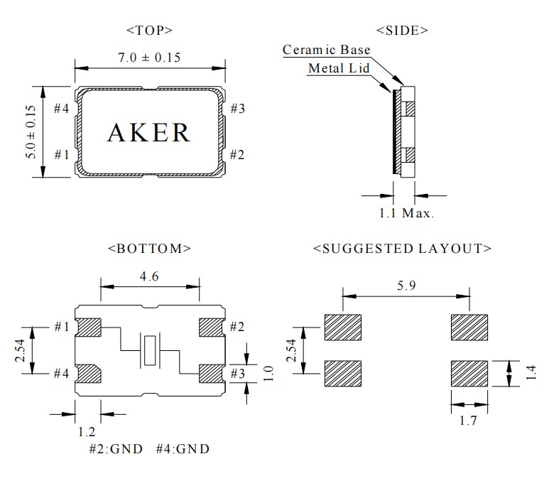 安碁7050mm貼片晶振,C7S-64.000-18-3050-3-R,藍牙模塊晶振,尺寸圖