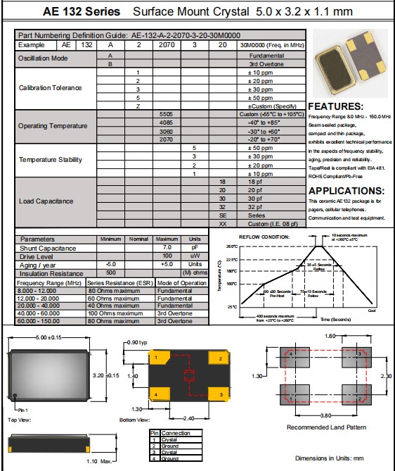 Anderson進口晶振,AE-132-A-3-5505-2-20-50M0000,尋呼機6G晶振,AE132晶體諧振器,四腳貼片晶振,參數表