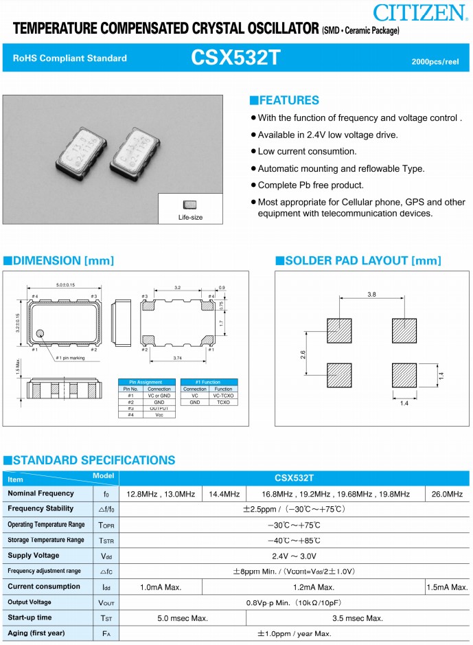 Citizen晶振 | CSX532T26.000M3-UT10 | CSX532T | 26MHz | TCXO | 2.4 V ~ 3 V |