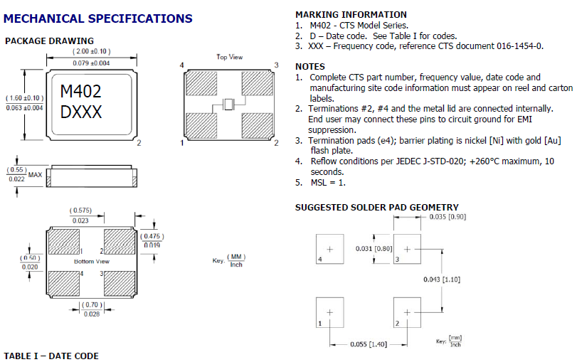 CTS西迪斯402四腳貼片晶振,402F2501XIAR通訊設備晶振,402F27011CAR,2016mm晶振,尺寸圖