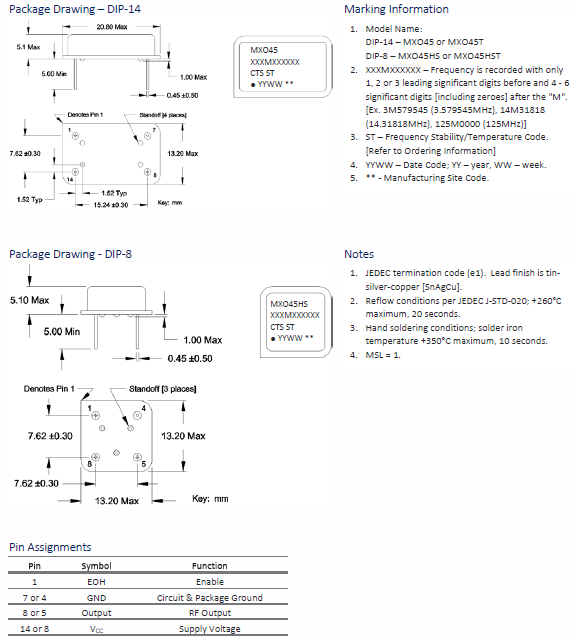 MXO45-3C-8M0000 | CTS晶振 | MXO45 | 8MHz | ±50ppm | 14-DIP, 4 Leads (Full Size, Metal Can) |