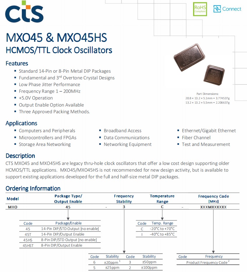 HCMOS時(shí)鐘振蕩器,MXO45-3C-18M4320,CTS有源晶振,參數(shù)表