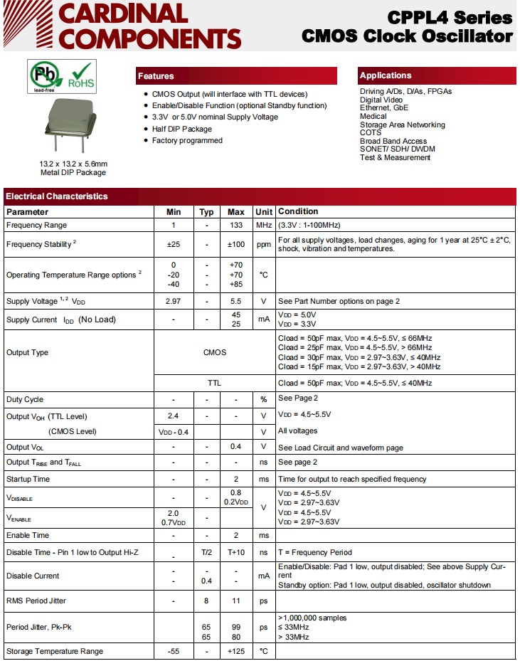 歐美Cardinal晶振/CPPLC4LTA5BR26.0TS/CMOS輸出振蕩器6G應(yīng)用,歐美進(jìn)口晶振,Cardinal卡迪納爾晶振,型號(hào):CPPL4系列,編碼為CPPLC4LTA5BR26.0TS,尺寸為:13.2x13.2x5.6mm金屬密封件封裝,頻率為:26.000MHz,石英晶振,插件晶振,石英晶體振蕩器,無(wú)鉛環(huán)保晶振,進(jìn)口晶振,CMOS輸出(將與TTL設(shè)備接口)啟用/禁用功能(可選備用功能)3.3V標(biāo)稱電源電壓半DIP包工廠編程,應(yīng)用于:驅(qū)動(dòng)A/D,D/As,F(xiàn)PGAs數(shù)字視頻,以太網(wǎng),GbE醫(yī)療,存儲(chǔ)區(qū)域,網(wǎng)絡(luò)COTS,寬帶接入,超聲波/SDH/DWDM,測(cè)試和測(cè)量。