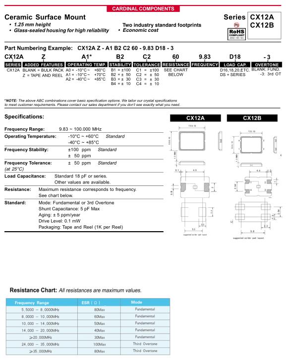 Mode: Fundamental or 3rd Overtone Shunt Capacitance: 5 pF Max Aging: ± 5 ppm/year Drive Level: 0.1 mW Packaging: Tape and Reel (1K per Reel) |