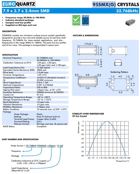 Euroquartz晶振,95SMX(G)晶振,32.768KHZ-955MX(G)±20PPM-12.5PF晶振,32.768K時鐘晶體具有小型,薄型,輕型的貼片晶振表面音叉型晶體振蕩器,產品具有優良的耐熱性,耐環境特性,可發揮晶振優良的電氣特性,符合RoHS規定,滿足無鉛焊接的高溫回流溫度曲線要求,金屬外殼的封裝使得產品在封裝時能發揮比陶瓷振蕩器外殼更好的耐沖擊性.