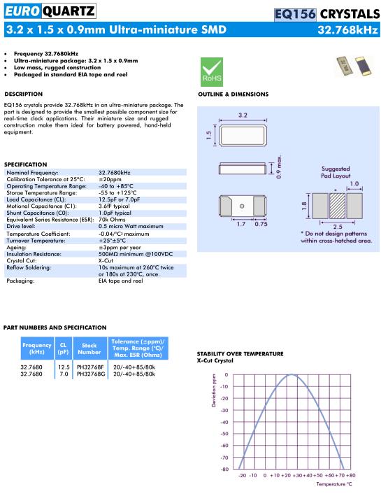 Euroquartz晶振,EQ156晶振,32.7680KHZ-12.5pF-PH32768F-20/-40+85/80k晶振,32.768K時(shí)鐘晶體具有小型,薄型,輕型的貼片晶振表面音叉型晶體振蕩器,產(chǎn)品具有優(yōu)良的耐熱性,耐環(huán)境特性,可發(fā)揮晶振優(yōu)良的電氣特性,符合RoHS規(guī)定,滿足無鉛焊接的高溫回流溫度曲線要求,金屬外殼的封裝使得產(chǎn)品在封裝時(shí)能發(fā)揮比陶瓷振蕩器外殼更好的耐沖擊性.
