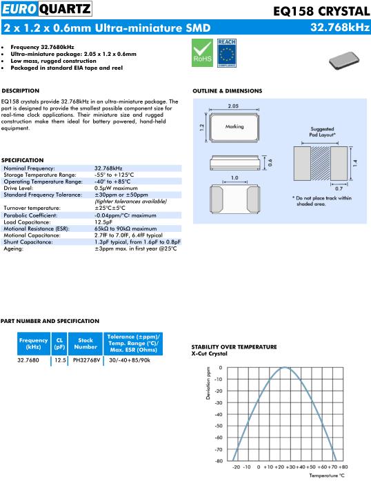 Euroquartz晶振,EQ158晶振,32.7680KHZ-12.5pF-PH32768V30/-40+85/90k晶振,貼片表晶32.768K系列具有超小型,薄型,質地輕的表面貼片音叉型石英晶體振蕩器,晶振產品本身具備優良的耐熱性,耐環境特性,在辦公自動化,家電領域,移動通信領域可發揮優良的電氣特性,符合無鉛標準,滿足無鉛焊接的回流溫度曲線要求,金屬外殼的石英晶振使得產品在封裝時能發揮比陶瓷晶振外殼更好的耐沖擊性能.