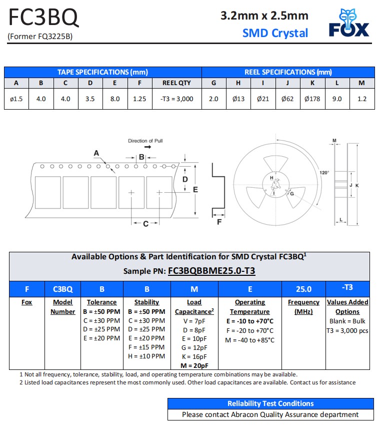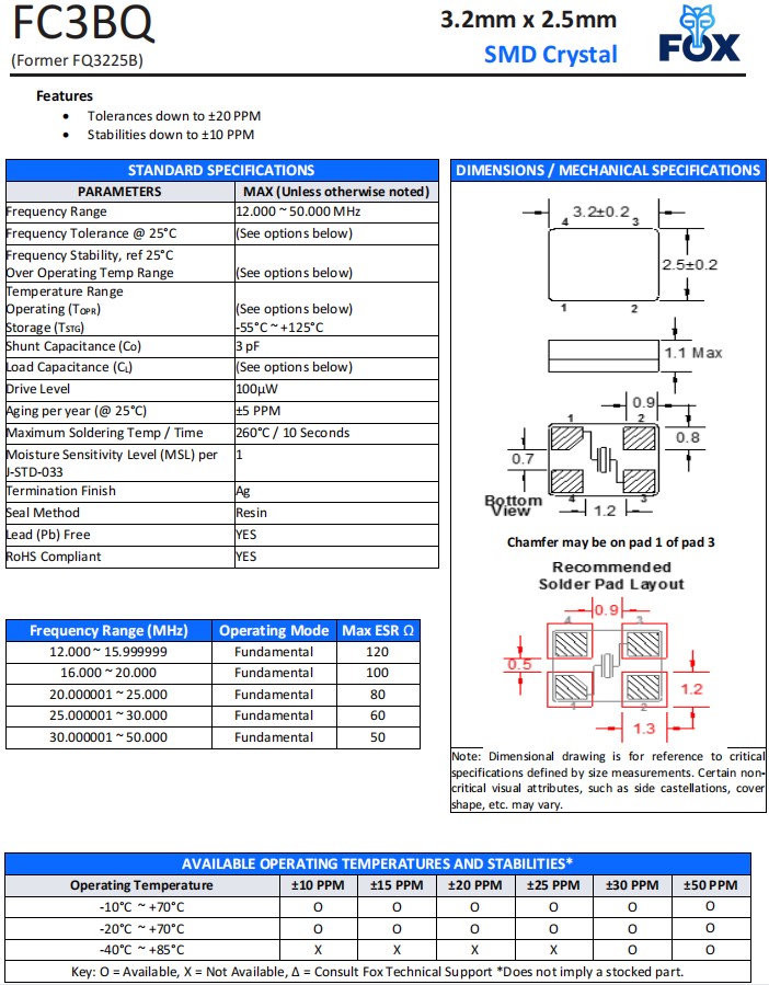 FQ3225BR-20.000 | Fox晶振 | FQ3225B | 20MHz | ±50ppm |