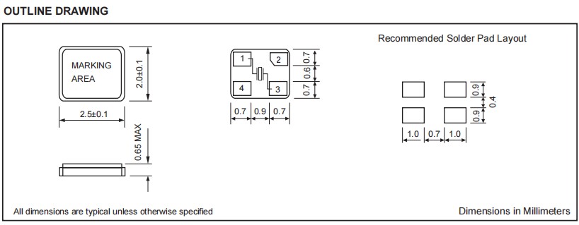 ●符合RoHS標準(無鉛),超小型設計(2.5x2.0x0.65mm)貼片晶振