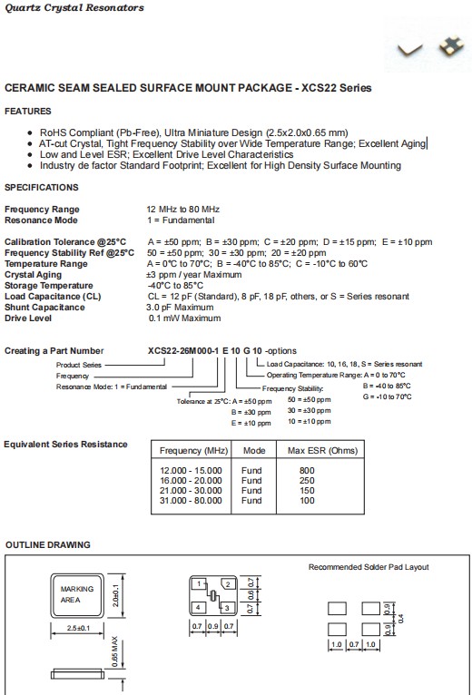 Fortiming耐高溫晶振,XCS22環(huán)保晶振,XCS22-13M560-1E20G10車載多媒體晶振,美國Fortiming晶振公司,富通晶振,XCS22晶振,XCS22-12M288-1E20G10晶振,2520晶振,石英晶振,貼片晶振,超小型晶振,網(wǎng)絡(luò)終端晶振,醫(yī)療設(shè)備晶振,低損耗晶振,SMD晶振,四腳晶振,低成本晶振,環(huán)保無鉛晶振,高穩(wěn)定性晶振,無源晶振陶瓷SEAM密封表面安裝包- XCS22系列具有RoHS兼容(無鉛),超微型設(shè)計(jì)(2.5x2.0x0.65 mm)切割晶體,在寬溫度范圍內(nèi)的頻率穩(wěn)定性;優(yōu)良的低老化水平和水平ESR;優(yōu)秀的驅(qū)動水平特性行業(yè)因素標(biāo)準(zhǔn)足跡;適用于高密度表面安裝