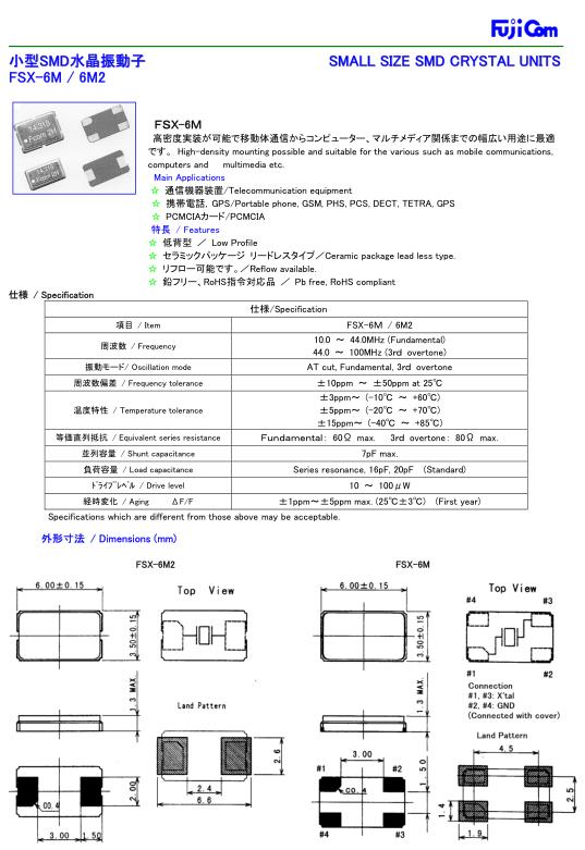 Fujicom晶振,FSX-6M晶振,6035mm晶振,小型貼片石英晶振,外觀尺寸具有薄型表面貼片型石英晶體振蕩器,特別適用于有小型化要求的市場領域,比如智能手機,無線藍牙,平板電腦等電子數碼產品.晶振本身超小型,薄型,重量輕,晶體具有優良的耐環境特性,如耐熱性,耐沖擊性,在辦公自動化,家電相關電器領域及Bluetooth,WirelessLAN等短距離無線通信領域可發揮優良的電氣特性,滿足無鉛焊接的回流溫度曲線要求.