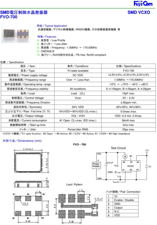 Fujicom晶振,FVO-700晶振,VCXO壓控晶振,小型SMD有源晶振,從最初超大體積到現在的7050mm,6035mm,5032mm,3225mm,2520mm體積,有著翻天覆地的改變,體積的變小也使產品帶來了更高的穩定性能,接縫密封石英晶體振蕩器,精度高,覆蓋頻率范圍寬的特點,SMD高速自動安裝和高溫回流焊設計,Optionable待機輸出三態輸出功能,電源電壓范圍:1.8V~5V,高穩定性,低抖動,低功耗,主要應用領域:無線通訊,高端智能手機,平板筆記本WLAN,藍牙,數碼相機,DSL和其他IT產品的晶振應用,三態功能,PC和LCDM等高端數碼領域,符合RoHS/無鉛.