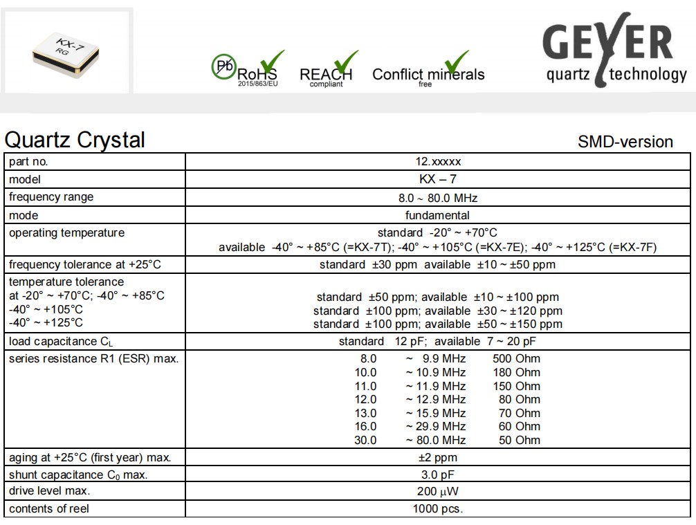 12.88752 | Geyer晶振 | Crystal 10.0Mhz 12pF SMD | KX-7 | 10 MHz |