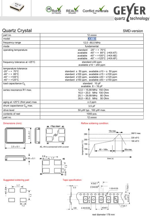 standard -20° ~ + 70°C available -40° ~ + 85°C (=KX-6T) available -40° ~ +105°C (=KX-6E) available -40° ~ +125°C (=KX-6F) |