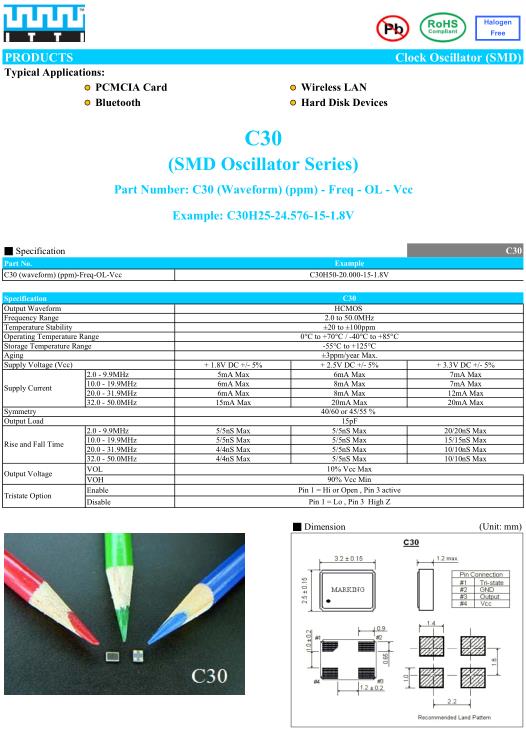 ITTI晶振,C30晶振,C30H25-24.000-15-1.8V晶振,小型SMD有源晶振,從最初超大體積到現在的7050mm,6035mm,5032mm,3225mm,2520mm體積,有著翻天覆地的改變,體積的變小也使產品帶來了更高的穩定性能,接縫密封石英晶體振蕩器,精度高,覆蓋頻率范圍寬的特點,SMD高速自動安裝和高溫回流焊設計,Optionable待機輸出三態輸出功能,電源電壓范圍:1.8V~5V,高穩定性,低抖動,低功耗,主要應用領域:無線通訊,高端智能手機,平板筆記本WLAN,藍牙,數碼相機,DSL和其他IT產品的晶振應用,三態功能,PC和LCDM等高端數碼領域,符合RoHS/無鉛.