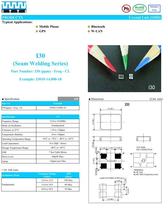 ITTI晶振,I30晶振,I3010-12.000-18晶振,超小型表面貼片型SMD晶振,最適合使用在汽車電子領(lǐng)域中,也是特別要求高可靠性的引擎控制用CPU的時鐘部分.低頻晶振可從7.98MHz起對應(yīng),小型,超薄型具備強防焊裂性,石英晶體在極端嚴(yán)酷的環(huán)境條件下也能發(fā)揮穩(wěn)定的起振特性,產(chǎn)品本身具有耐熱,耐振,耐撞擊等優(yōu)良的耐環(huán)境特性,滿足無鉛焊接以及高溫回流溫度曲線要求,符合AEC-Q200標(biāo)準(zhǔn).