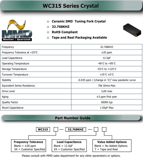 MMDCOMP晶振是美國一家全面服務的頻率元器件制造商.自公司成立以來MMDCOMP晶振便已成為一家服務型技術公司,致力于向市場提供石英晶體,溫補晶振,壓控晶振等元件.麥迪康晶振,WC315晶振,WC315-XX-32.768KHZ-XXT晶振.