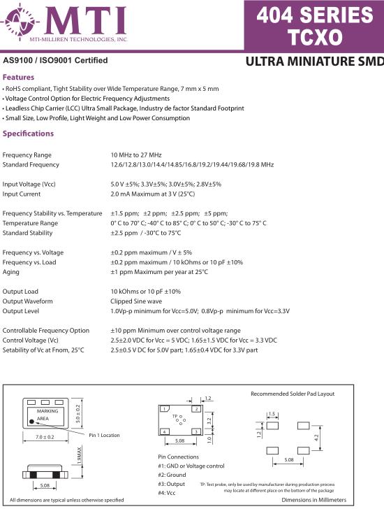 MTI晶振,404晶振,TCXO溫補(bǔ)晶振,小型SMD有源晶振,從最初超大體積到現(xiàn)在的7050mm,6035mm,5032mm,3225mm,2520mm體積,有著翻天覆地的改變,體積的變小也使產(chǎn)品帶來了更高的穩(wěn)定性能,接縫密封石英晶體振蕩器,精度高,覆蓋頻率范圍寬的特點(diǎn),SMD高速自動(dòng)安裝和高溫回流焊設(shè)計(jì),Optionable待機(jī)輸出三態(tài)輸出功能,電源電壓范圍:1.8V~5V,高穩(wěn)定性,低抖動(dòng),低功耗,主要應(yīng)用領(lǐng)域:無線通訊,高端智能手機(jī),平板筆記本W(wǎng)LAN,藍(lán)牙,數(shù)碼相機(jī),DSL和其他IT產(chǎn)品的晶振應(yīng)用,三態(tài)功能,PC和LCDM等高端數(shù)碼領(lǐng)域,符合RoHS/無鉛.
