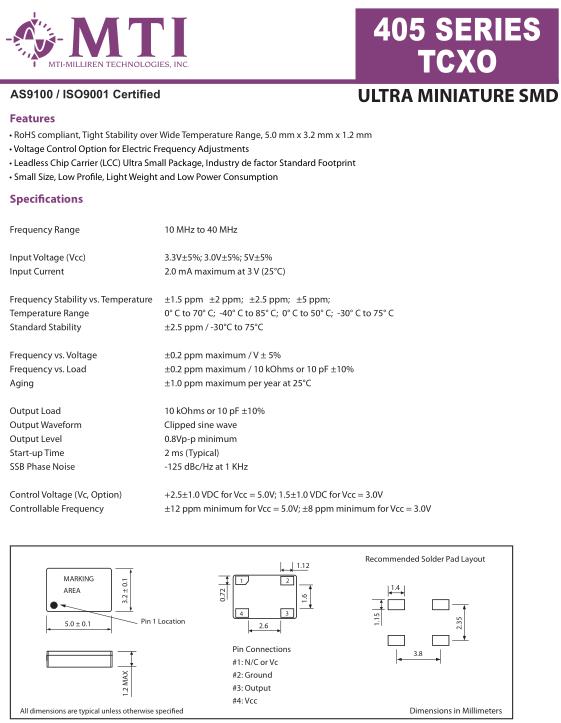 MTI晶振,405晶振,5032mm晶振,5032mm體積的石英晶體振蕩器,有源晶振,該產(chǎn)品可驅(qū)動(dòng)2.5V的溫補(bǔ)晶振,壓控晶振,VC-TCXO晶體振蕩器產(chǎn)品,電源電壓的低電耗型,編帶包裝方式,可對(duì)應(yīng)自動(dòng)高速貼片機(jī)自動(dòng)焊接,及IR回流焊接(無鉛對(duì)應(yīng)),為無鉛產(chǎn)品,超小型,質(zhì)地輕.產(chǎn)品被廣泛應(yīng)用到集成電路,程控交換系統(tǒng),無線發(fā)射基站.