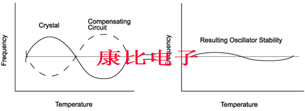 使用標準補償技術,可以在-40℃至+85℃的溫度范圍內實現約±1ppm的分數穩定性.在較窄的溫度范圍內可以實現更好的穩定性.除了最簡單的TCXO晶振之外,所有技術都采用的實際技術是基于與晶振串聯使用的變容二極管,如下所示: 電壓的變化引起變容二極管的電容變化,導致振蕩頻率的變化.熱敏電阻網絡適用于晶體,使電壓隨溫度變化,從而補償晶體的頻率與溫度特性.由于每個TCXO要求其補償網絡與其單個晶體匹配,因此TCXO的成本與頻率與溫度規格的難度密切相關.