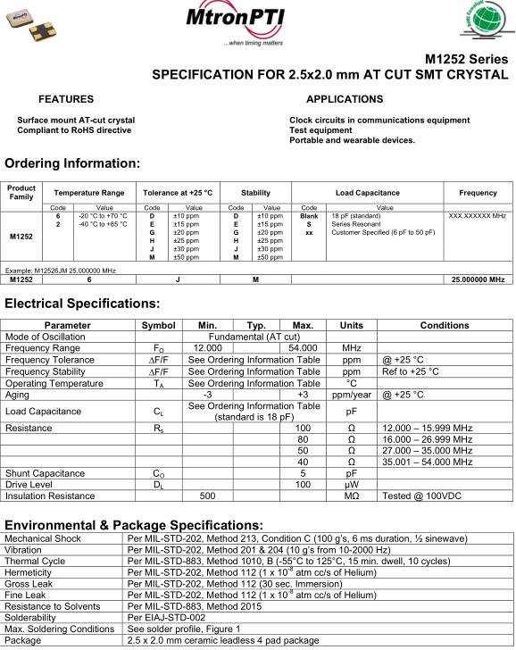 MtronPTI晶振,M1252晶振,M12526JM24.000000MHz晶振,小型貼片石英晶振,外觀尺寸具有薄型表面貼片型石英晶體振蕩器,特別適用于有小型化要求的市場領域,比如智能手機,無線藍牙,平板電腦等電子數(shù)碼產(chǎn)品.晶振本身超小型,薄型,重量輕,晶體具有優(yōu)良的耐環(huán)境特性,如耐熱性,耐沖擊性,在辦公自動化,家電相關電器領域及Bluetooth,WirelessLAN等短距離無線通信領域可發(fā)揮優(yōu)良的電氣特性,滿足無鉛焊接的回流溫度曲線要求.