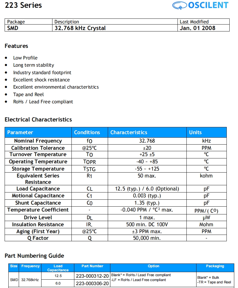 Oscilent陶瓷晶振\223-000312-20\6G時鐘晶振\223音叉晶體 參數表