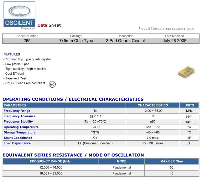Oscilent晶振,265-12.0M-20-S-TR晶振,7050mm晶振,貼片晶振本身體積小,超薄型石英晶體振蕩器,特別適用于有目前高速發展的高端電子數碼產品,因為晶振本身小型化需求的市場領域,小型,薄型是對應陶瓷振蕩器(偏差大)和普通的石英晶體振蕩器(偏差小)的中間領域的一種性價比較出色的產品.產品廣泛用于筆記本電腦,無線電話,衛星導航SSD,USB,Blu-ray等用途,符合無鉛焊接的高溫回流焊曲線特性.