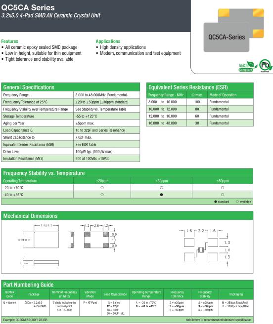 QANTEK晶振,QC5CA晶振,QC5CA16.0000F12B33R晶振,智能手機晶振,產品具有高精度超小型的表面貼片型石英晶體振蕩器,最適用于移動通信終端的基準時鐘等移動通信領域.比如智能手機,無線通信,衛星導航,平臺基站等較高端的數碼產品,晶振本身小型,薄型具備各類移動通信的基準時鐘源用頻率,貼片晶振具有優良的電氣特性,耐環境性能適用于移動通信領域,滿足無鉛焊接的高溫回流溫度曲線要求.