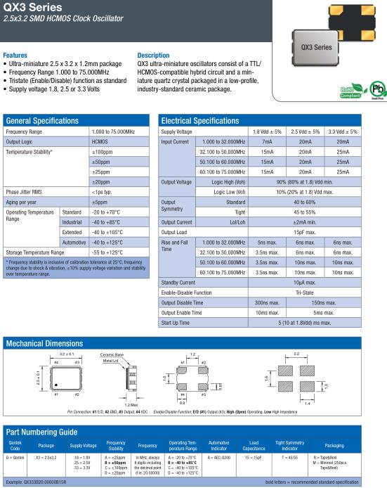 QANTEK晶振,QX3晶振,QX333B24.00000B15R晶振,小型SMD有源晶振,從最初超大體積到現在的7050mm,6035mm,5032mm,3225mm,2520mm體積,有著翻天覆地的改變,體積的變小也使產品帶來了更高的穩定性能,接縫密封石英晶體振蕩器,精度高,覆蓋頻率范圍寬的特點,SMD高速自動安裝和高溫回流焊設計,Optionable待機輸出三態輸出功能,電源電壓范圍:1.8V~5V,高穩定性,低抖動,低功耗,主要應用領域:無線通訊,高端智能手機,平板筆記本WLAN,藍牙,數碼相機,DSL和其他IT產品的晶振應用,三態功能,PC和LCDM等高端數碼領域,符合RoHS/無鉛.