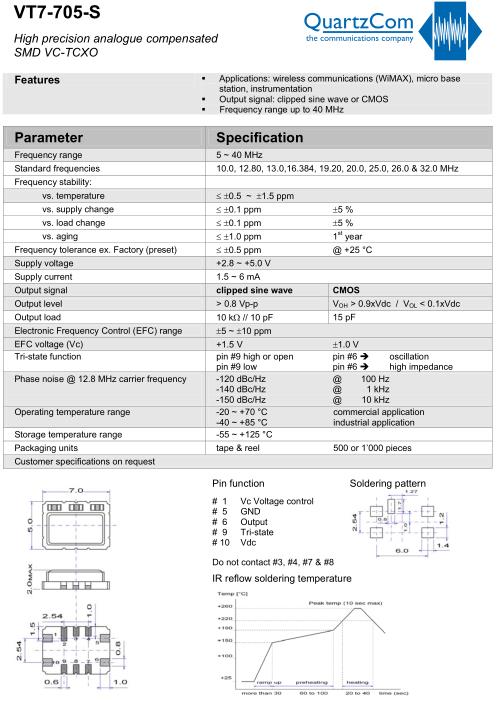 QuartzCom晶振,VT7-705-S晶振,無線通信專用晶振,小型SMD有源晶振,從最初超大體積到現(xiàn)在的7050mm,6035mm,5032mm,3225mm,2520mm體積,有著翻天覆地的改變,體積的變小也使產(chǎn)品帶來了更高的穩(wěn)定性能,接縫密封石英晶體振蕩器,精度高,覆蓋頻率范圍寬的特點(diǎn),SMD高速自動(dòng)安裝和高溫回流焊設(shè)計(jì),Optionable待機(jī)輸出三態(tài)輸出功能,電源電壓范圍:1.8V~5V,高穩(wěn)定性,低抖動(dòng),低功耗,主要應(yīng)用領(lǐng)域:無線通訊,高端智能手機(jī),平板筆記本W(wǎng)LAN,藍(lán)牙,數(shù)碼相機(jī),DSL和其他IT產(chǎn)品的晶振應(yīng)用,三態(tài)功能,PC和LCDM等高端數(shù)碼領(lǐng)域,符合RoHS/無鉛.