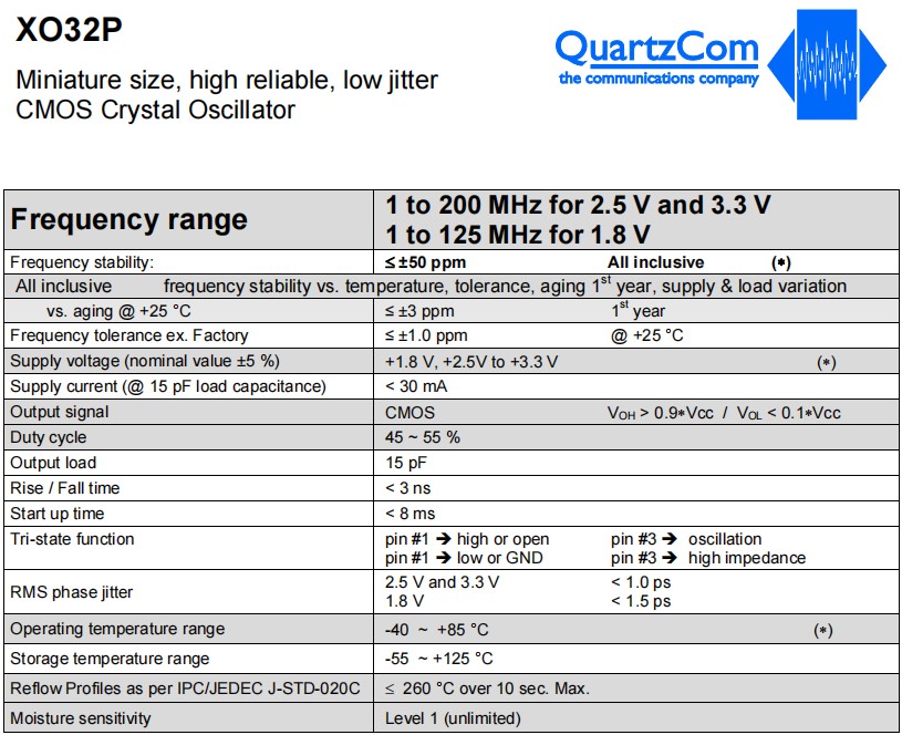 XO32P-H33-NN1u25-100.000MHz,3225mm,QuartzCom高可靠晶振,XO32P,低抖動(dòng)晶振,參數(shù)表