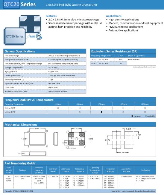Quarztechnik晶振,QTC20晶振,QTC2012.0000FBT3I30R晶振,貼片晶振本身體積小,超薄型石英晶體振蕩器,特別適用于有目前高速發展的高端電子數碼產品,因為晶振本身小型化需求的市場領域,小型,薄型是對應陶瓷振蕩器(偏差大)和普通的石英晶體振蕩器(偏差小)的中間領域的一種性價比較出色的產品.產品廣泛用于筆記本電腦,無線電話,衛星導航SSD,USB,Blu-ray等用途,符合無鉛焊接的高溫回流焊曲線特性.
