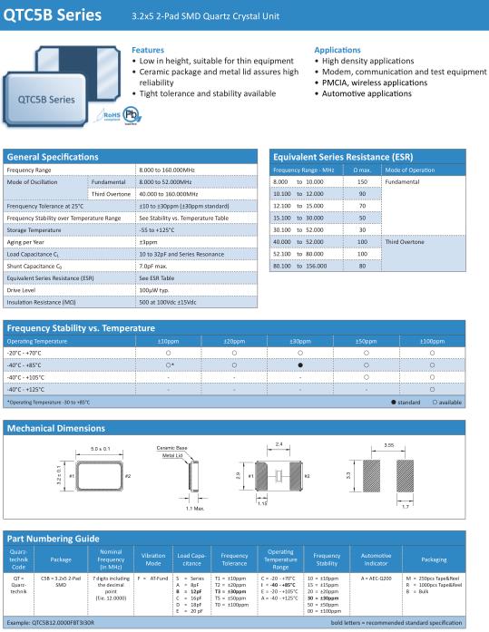 Quarztechnik晶振,QTC5B晶振,QTC5B16.0000FBT3I30R晶振,小型表面貼片晶振型,是標(biāo)準(zhǔn)的石英晶體振蕩器,適用于寬溫范圍的電子數(shù)碼產(chǎn)品,家電電器及MP3,MP4,播放器,單片機(jī)等領(lǐng)域.可對應(yīng)8.000MHz以上的頻率,在電子數(shù)碼產(chǎn)品,以及家電相關(guān)電器領(lǐng)域里面發(fā)揮優(yōu)良的電氣特性,滿足無鉛焊接的回流溫度曲線要求.
