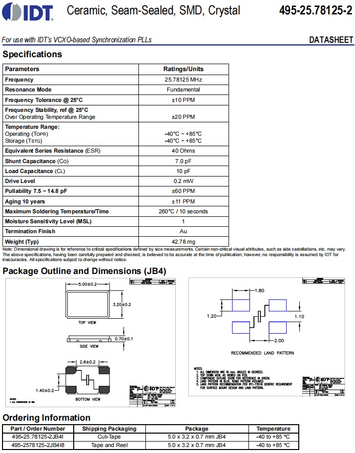 6G車載導航晶振,495-25.78125-2JB4I,Renesas石英晶體諧振器,參數表