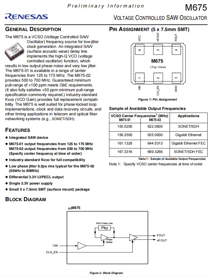 M675-02-AH | Renesas晶振 | XTAL OSC VCSO 669.3266MHZ LVPECL | M675 |
