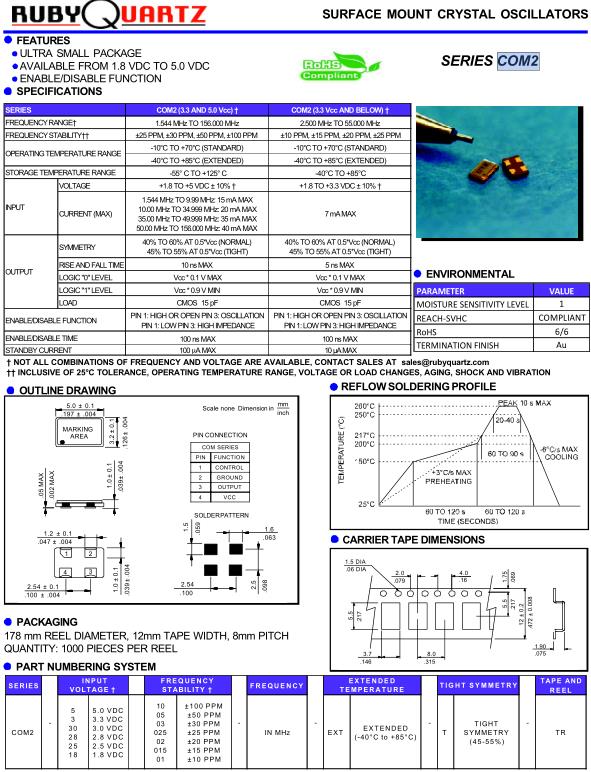 Rubyquartz晶振,COM2晶振,COM2-3025-12.000-EXT-T-TR晶振,5032mm體積的石英晶體振蕩器,有源晶振,該產品可驅動2.5V的溫補晶振,VCXO壓控晶振,VC-TCXO晶體振蕩器產品,電源電壓的低電耗型,編帶包裝方式,可對應自動高速貼片機自動焊接,及IR回流焊接(無鉛對應),為無鉛產品,超小型,質地輕.產品被廣泛應用到集成電路,程控交換系統,無線發射基站.