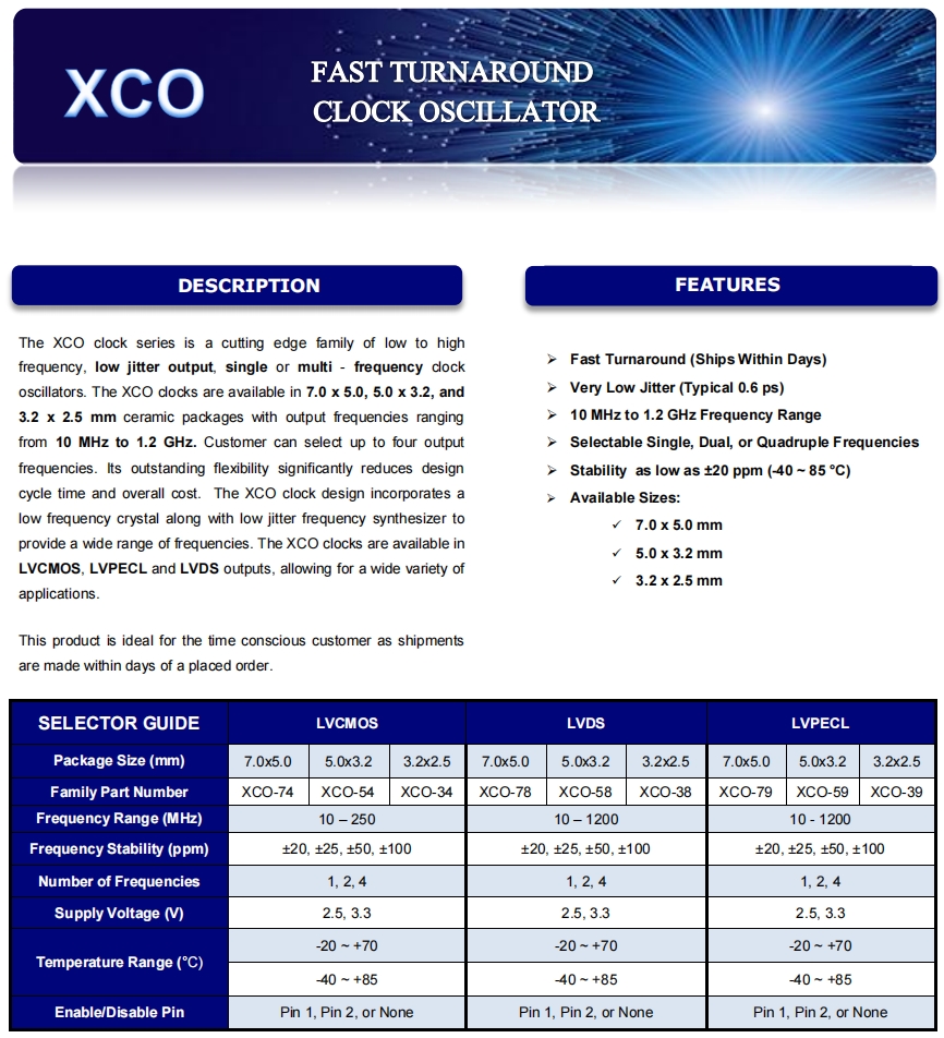 XCO時鐘有源晶振系列是一個從低到高的尖端系列頻率,低抖動輸出,單頻或多頻時鐘振蕩器。XCO時鐘有7.0 x 5.0、5.0 x 3.2和3.2 x 2.5 mm陶瓷封裝,輸出頻率范圍從10MHz到1.2GHz。客戶最多可以選擇四個輸出頻率。其卓越的靈活性顯著降低了設計周期時間和總成本。XCO時鐘設計包含低頻晶體與低抖動頻率合成器提供寬范圍的頻率。XCO時鐘可在LVCMOS、LVPECL和LVDS輸出,允許多種應用程序。Rubyquartz差分振蕩器,XCO793HU22-156.250,6G路由器晶振.