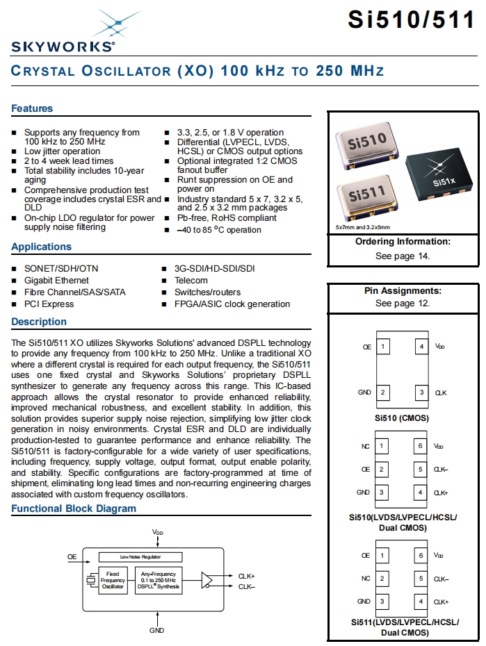 511JCA200M000BAG | Skyworks有源晶振 | XTAL OSC XO 200.0000MHZ LVDS SMD | Si511 | 200 MHz | LVDS | 1.8V |