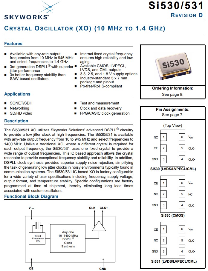 思佳訊LVPECL振蕩器,530EC125M000DG,Si530差分晶體振蕩器,Skyworks思佳訊晶振,進口晶振,型號:Si530,編碼為:530EC125M000DG,頻率為:125.000MHz,小體積晶振尺寸:7.0x5.0mm封裝,六腳貼片晶振,LVPECL差分晶體振蕩器,石英晶振,有源晶振,差分晶振,石英晶體振蕩器。具有超小型,輕薄型,低抖動,低功耗,低相位噪聲,低電源電壓,低電平,低耗能等特點。應用于:超聲波/SDH,網絡,SD/HD視頻,測試和測量,時鐘和數據恢復,FPGA/ASIC時鐘生成。