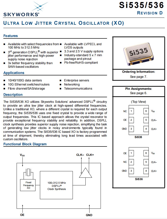 Skyworks晶體振蕩器,535BC312M500DGR,Si535光纖通道晶振,美國進口晶振,Skyworks思佳訊晶振,型號:Si535,編碼為:535BC312M500DGR,頻率為:312.500MHz,小體積晶振尺寸:7.0x5.0mm封裝,六腳貼片晶振,LVDS輸出差分晶振,石英晶振,有源晶振,差分晶體振蕩器。具有超小型,輕薄型,低抖動,低功耗,低相位噪聲,低電源電壓,高精度,高性能,高品質等特點。應用于:藍牙晶振,10/40/100G數據中心,10G以太網,交換機/路由器,光纖通道/SAS/存儲,企業服務器,網絡,電信,光模塊,無線網絡等應用。