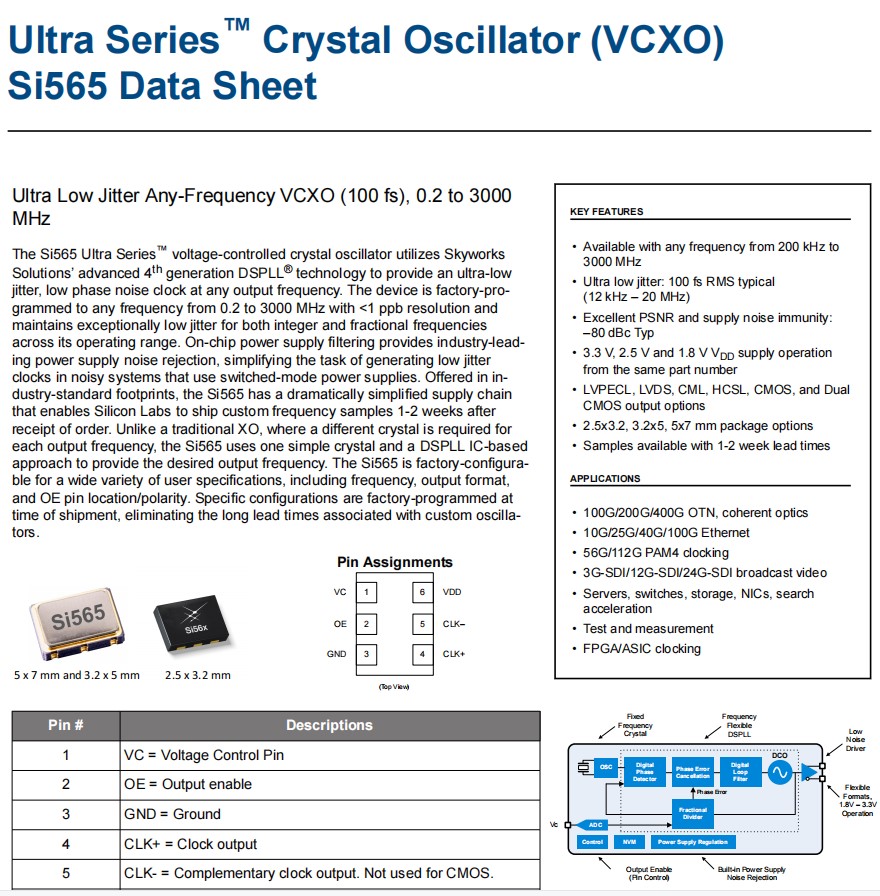 Skyworks高精度晶振,565BAA122M880BCGR,Si565測(cè)試設(shè)備晶振,美國(guó)進(jìn)口晶振,Skyworks思佳訊晶振,型號(hào):Si565,編碼為:565BAA122M880BCGR,頻率為:122.88MHz,小體積晶振尺寸:5.0x3.2mm封裝,六腳貼片晶振,LVDS振蕩器,VCXO壓控振蕩器,石英晶振,有源晶振,差分晶體振蕩器。超低抖動(dòng)任意頻率VCXO(100 fs),具有超小型,輕薄型,低抖動(dòng),低功耗,低相位噪聲,低電源電壓等特點(diǎn)。應(yīng)用于:100G/200G/400G OTN,相干光學(xué),10G/25G/40G/100G以太網(wǎng),56G/112G PAM4時(shí)鐘,3G-SDI/12G-SDI/24G-SDI廣播視頻,服務(wù)器、交換機(jī)、存儲(chǔ)、NIC、搜索加速,測(cè)試和測(cè)量,F(xiàn)PGA/ASIC時(shí)鐘,物聯(lián)網(wǎng),光纖通訊等應(yīng)用。