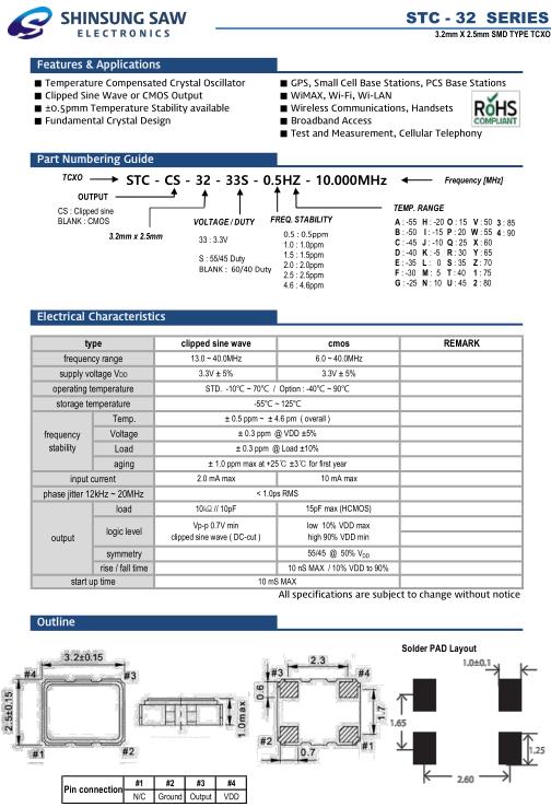 Shinsung晶振,STC-32晶振,STC-CS-32-33S-0.5HZ-20.000MHz晶振,小型SMD有源晶振,從最初超大體積到現(xiàn)在的7050mm,6035mm,5032mm,3225mm,2520mm體積,有著翻天覆地的改變,體積的變小也使產(chǎn)品帶來了更高的穩(wěn)定性能,接縫密封石英晶體振蕩器,精度高,覆蓋頻率范圍寬的特點,SMD高速自動安裝和高溫回流焊設(shè)計,Optionable待機輸出三態(tài)輸出功能,電源電壓范圍:1.8V~5V,高穩(wěn)定性,低抖動,低功耗,主要應(yīng)用領(lǐng)域:無線通訊,高端智能手機,平板筆記本W(wǎng)LAN,藍牙,數(shù)碼相機,DSL和其他IT產(chǎn)品的晶振應(yīng)用,三態(tài)功能,PC和LCDM等高端數(shù)碼領(lǐng)域,符合RoHS/無鉛.