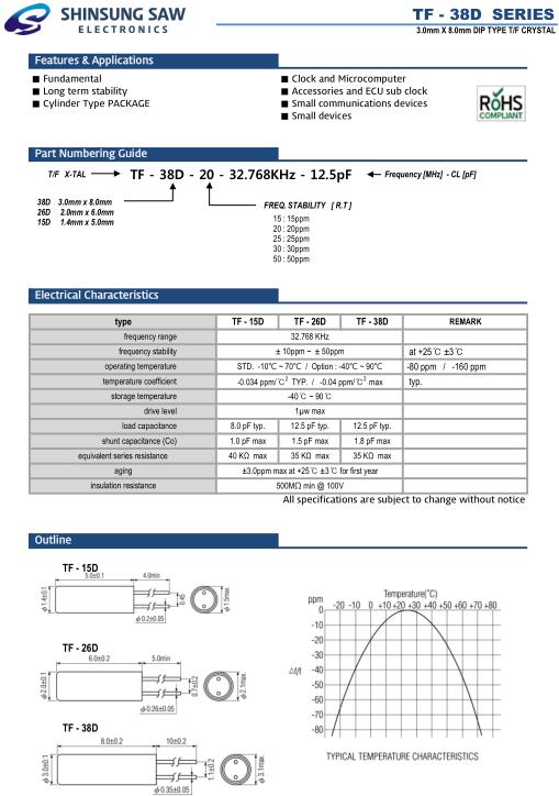 SHINSUNG Crysta成立于1990年,并開始生產石英晶振,濾波器,石英晶體振蕩器,向客戶提供最新的最新的新松貼片晶振或通孔型晶振單元,時鐘有源晶振,溫補晶振等晶振產品,一直以供應優質晶振產品為信念,不斷給社會創造價值.Shinsung晶振,TF-38D晶振,TF-38D-20-32.768KHz-10pF晶振.