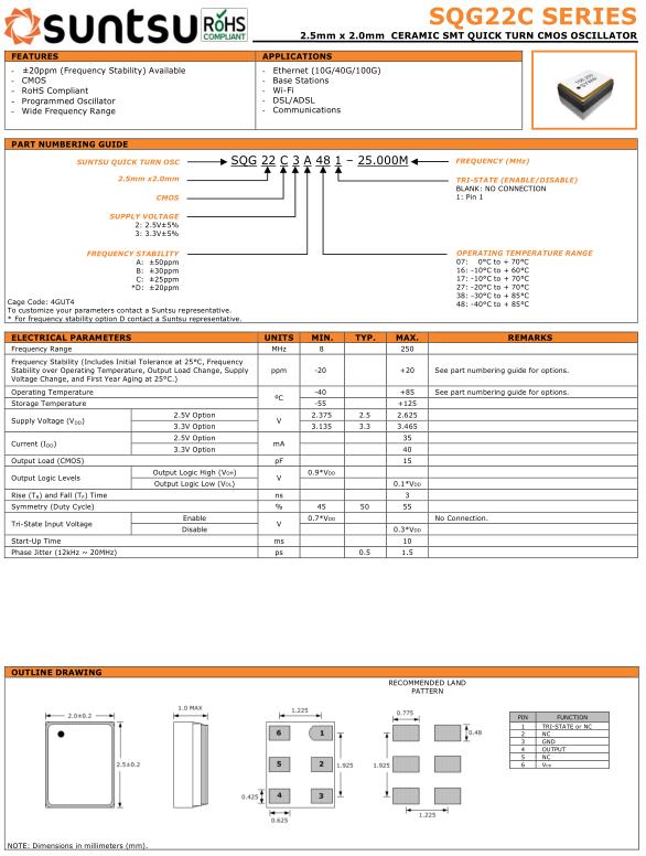 Suntsu晶振,SQG22C晶振,SQG22C3A481-24.000M晶振,有源晶振,是指晶體本身起振需要外部電壓供應,起振后可直接驅動CMOS集成電路,產品本身已實現與薄型IC(TSSOP封裝,TVSOP封裝)同樣的1mm厚度,斷開時的消費電流是15µA以下,編帶包裝方式可對應自動搭載及IR回流焊接(無鉛對應)產品有幾種電壓供選1.8V,2.5V,3V3.3V,5V,以應對不同IC產品需要.