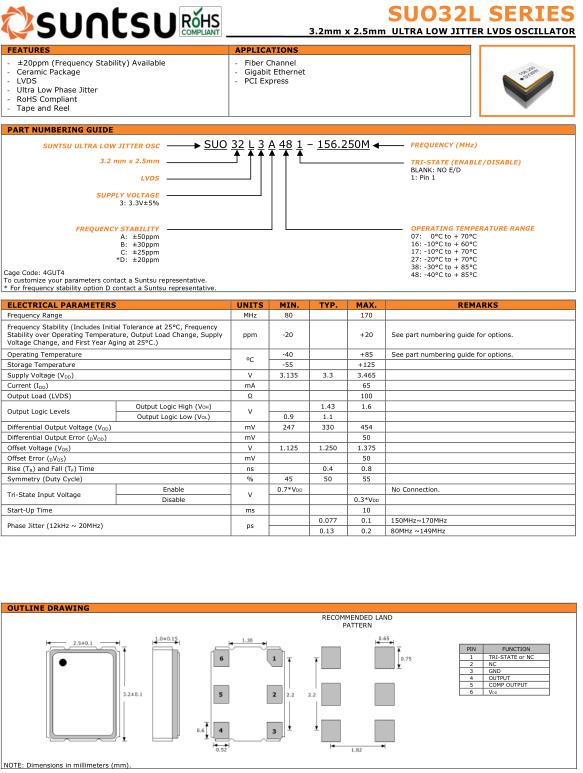 Suntsu晶振,SUO32L晶振,SUO32L3A481-80.000M晶振,小型SMD有源晶振,從最初超大體積到現(xiàn)在的7050mm,6035mm,5032mm,3225mm,2520mm體積,有著翻天覆地的改變,體積的變小也使產(chǎn)品帶來(lái)了更高的穩(wěn)定性能,接縫密封石英晶體振蕩器,精度高,覆蓋頻率范圍寬的特點(diǎn),SMD高速自動(dòng)安裝和高溫回流焊設(shè)計(jì),Optionable待機(jī)輸出三態(tài)輸出功能,電源電壓范圍:1.8V~5V,高穩(wěn)定性,低抖動(dòng),低功耗,主要應(yīng)用領(lǐng)域:無(wú)線通訊,高端智能手機(jī),平板筆記本W(wǎng)LAN,藍(lán)牙,數(shù)碼相機(jī),DSL和其他IT產(chǎn)品的晶振應(yīng)用,三態(tài)功能,PC和LCDM等高端數(shù)碼領(lǐng)域,符合RoHS/無(wú)鉛.
