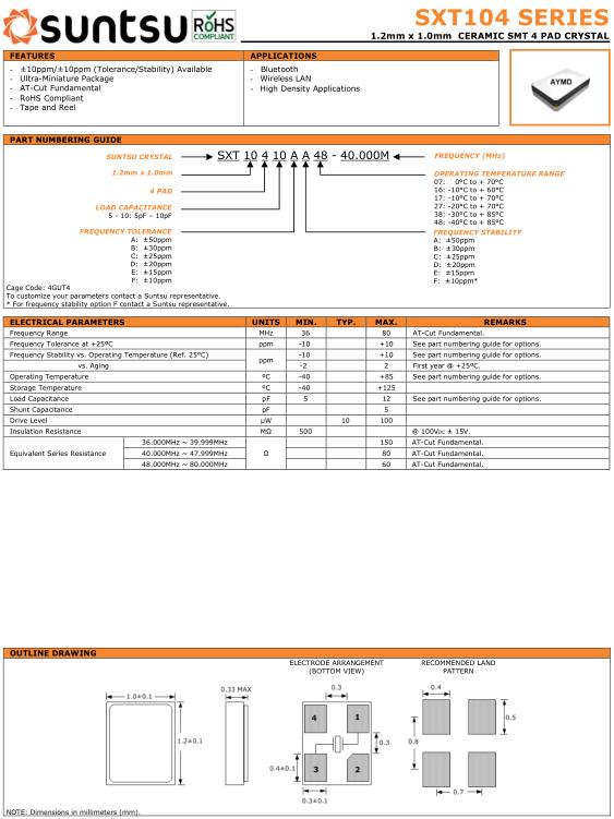 Suntsu晶振,SXT104晶振,SXT10410AA48-40.000M晶振,貼片晶振本身體積小,超薄型石英晶體振蕩器,特別適用于有目前高速發展的高端電子數碼產品,因為晶振本身小型化需求的市場領域,小型,薄型是對應陶瓷振蕩器(偏差大)和普通的石英晶體振蕩器(偏差小)的中間領域的一種性價比較出色的產品.產品廣泛用于筆記本電腦,無線電話,衛星導航SSD,USB,Blu-ray等用途,符合無鉛焊接的高溫回流焊曲線特性.