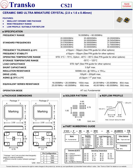 SPECIFICATION-Transko晶振 | CS21 |